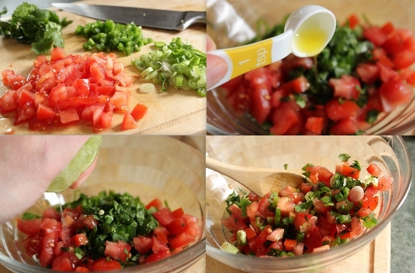 - Chop, tomatoes, green onion, jalapeno pepper (remove seeds) and cilantro into small pieces.