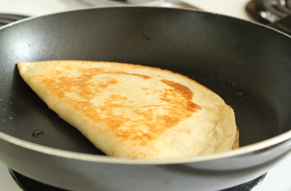 Pre-heat the oil in the skillet before placing the quesadilla you’ve assembled in it. Hot oil fries the tortilla and makes it crisp on the outside (good!). Cool oil seeps into the tortilla and makes it soggy (not so good). To check if the oil is hot, flick some water from your fingertips into the skillet. If the oil pops, it’s hot.