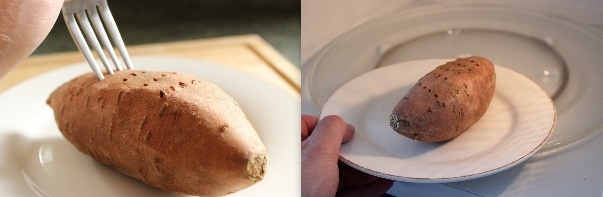 - Poke holes in sweet potato with a fork. Microwave on high power until cooked, about 5 minutes. Carefully remove from microwave (plate will be hot). Let cool.