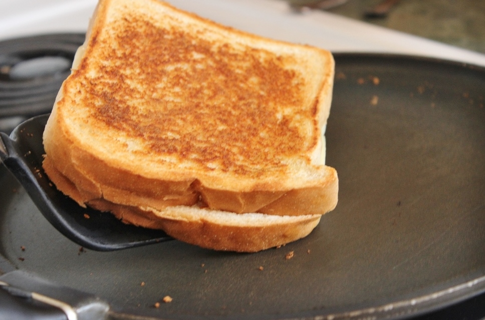 - Heat a non-stick skillet over medium heat. Place sandwich on skillet and cook until bread on the outside is golden brown and cheese melts, about 3 minutes per side.