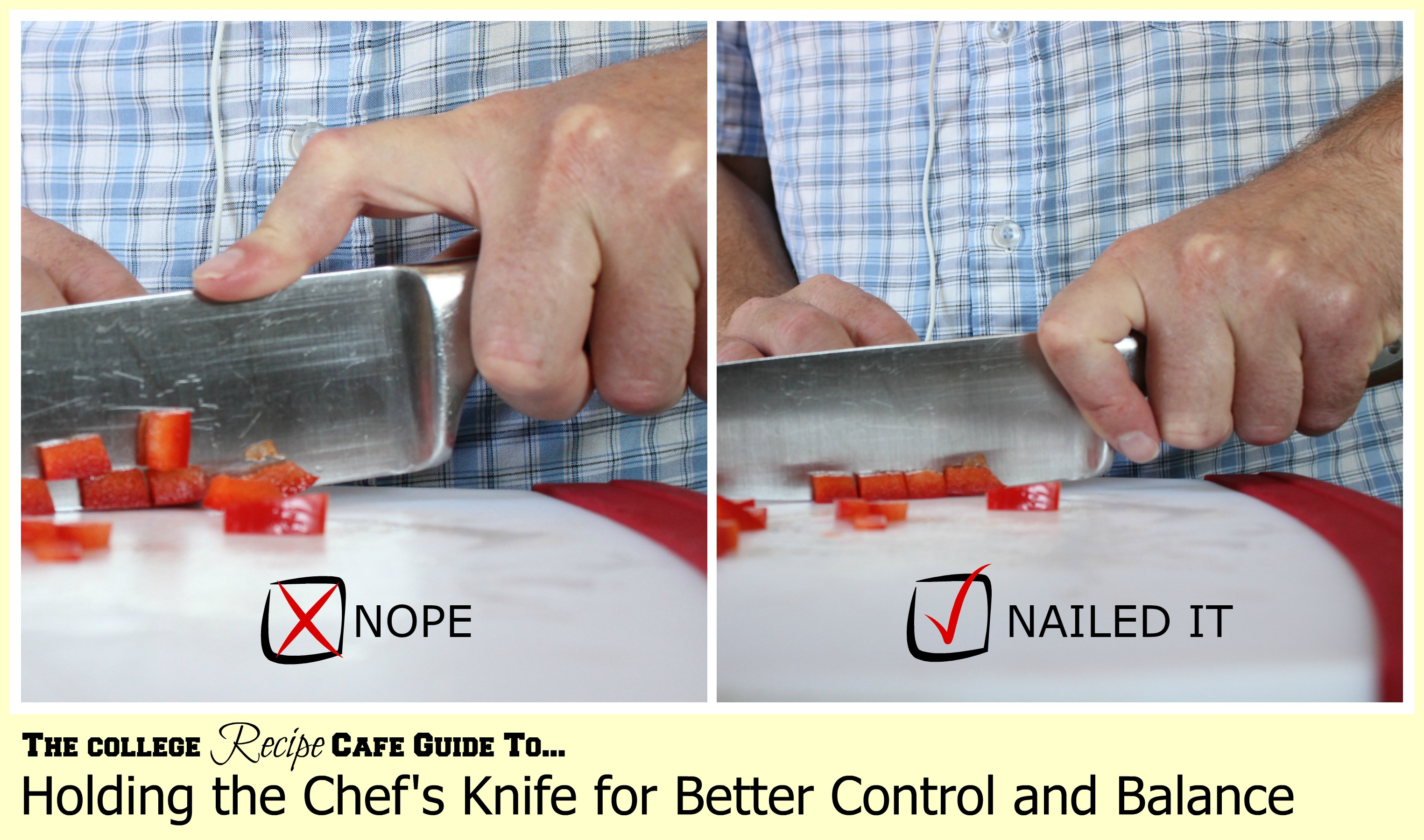 For the longest time I placed my index along the top edge of the chef’s knife when I diced and chopped food. It felt comfortable but it allowed the blade to easily jut out to the side when my hands or the cutting board got wet.