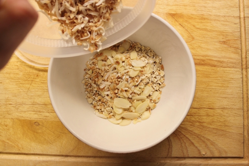 - In a microwave safe cereal bowl, combine oats, coconut, almonds, salt and brown sugar.