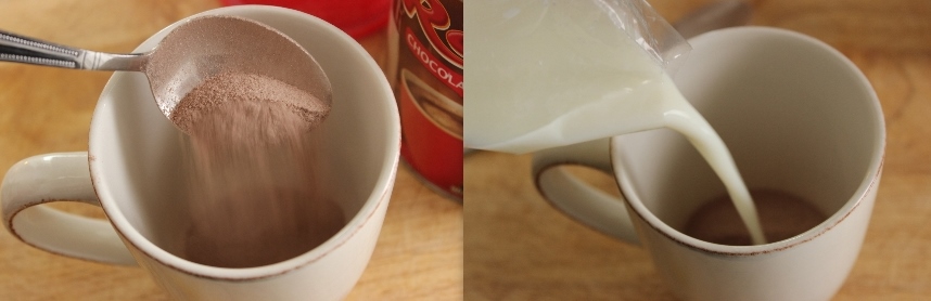 Begin with two big scoops of your favorite hot chocolate mix in your mug (our favorite is Rolo Hot Chocolate Mix because it includes caramel flavor)! Then add enough milk or almond milk to cover the hot chocolate mix.