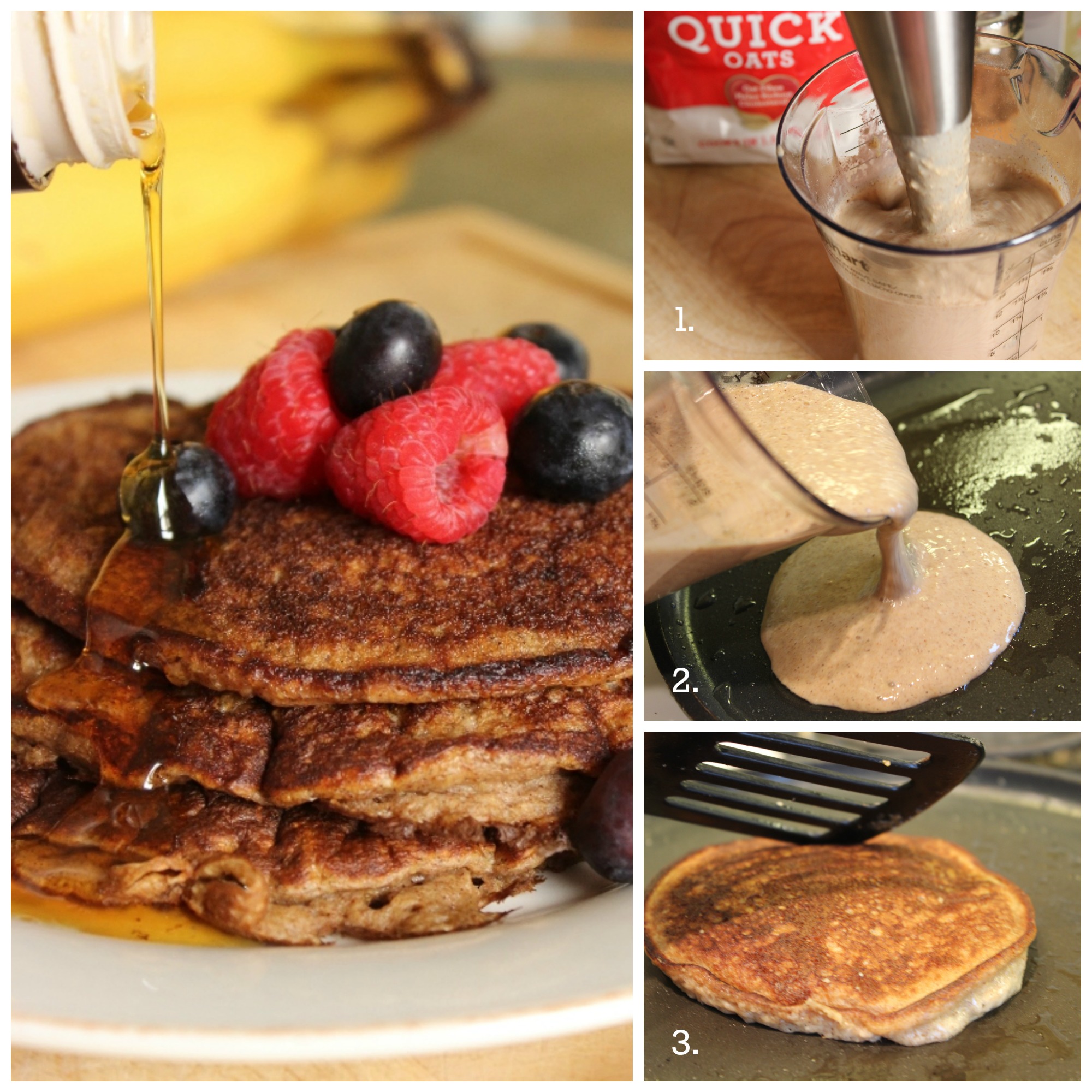 The ingredients you need to make the batter for these tasty oatmeal pancakes are ones you likely already have if you bake. Simply blend them in a blender like an oatmeal smoothie.