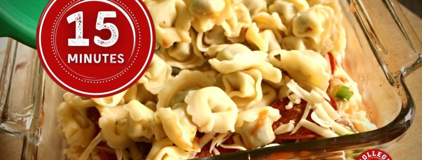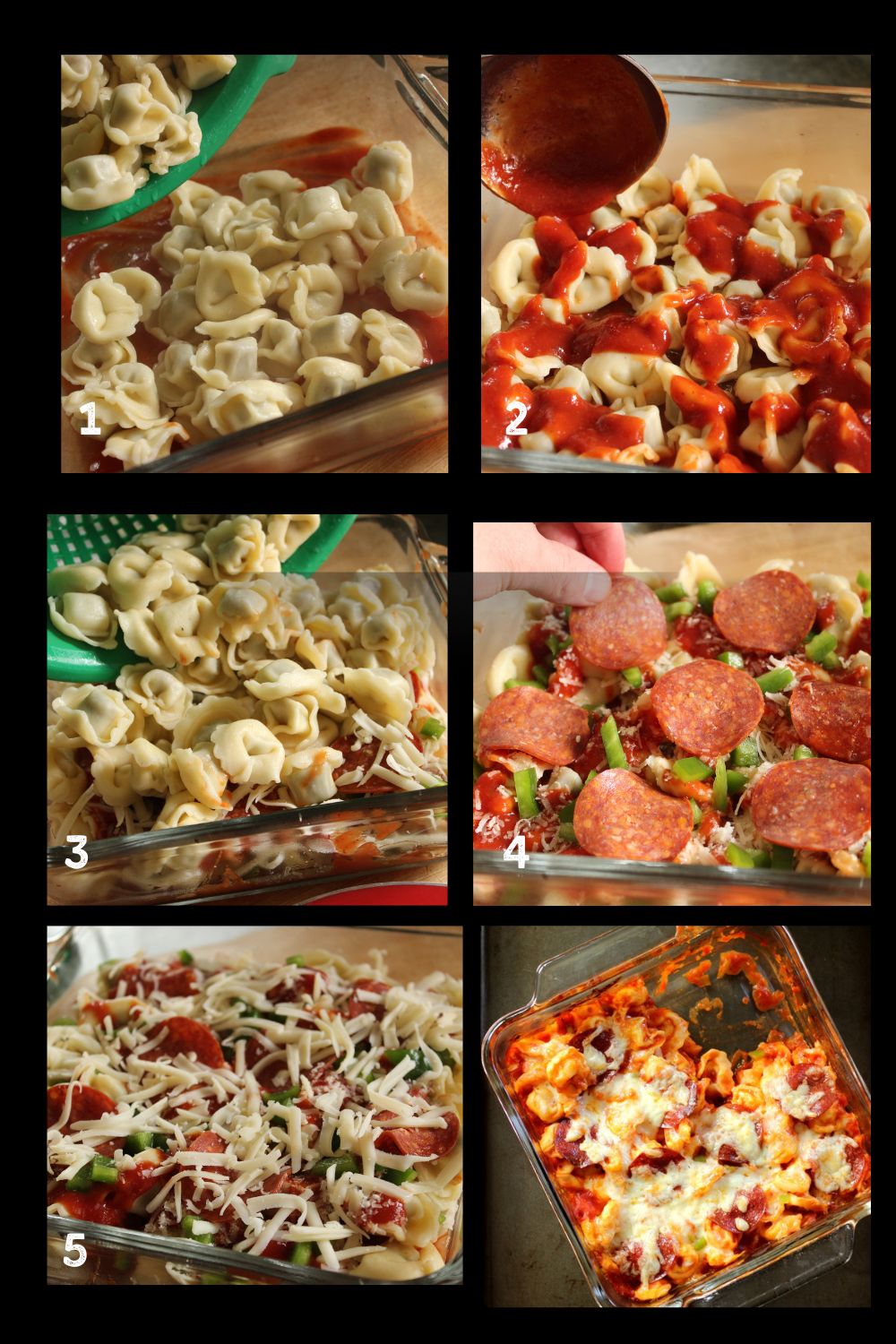 - In an 8 x 8 casserole dish, spoon a little pizza sauce over the bottom of the dish. Evenly spread half of the cooked tortellini on top. Pour half of the remaining pizza sauce over tortellini, followed by the Parmesan cheese and remaining cooked tortellini. Top with remaining pizza sauce, bell peppers, pepperoni and mozzarella cheese.