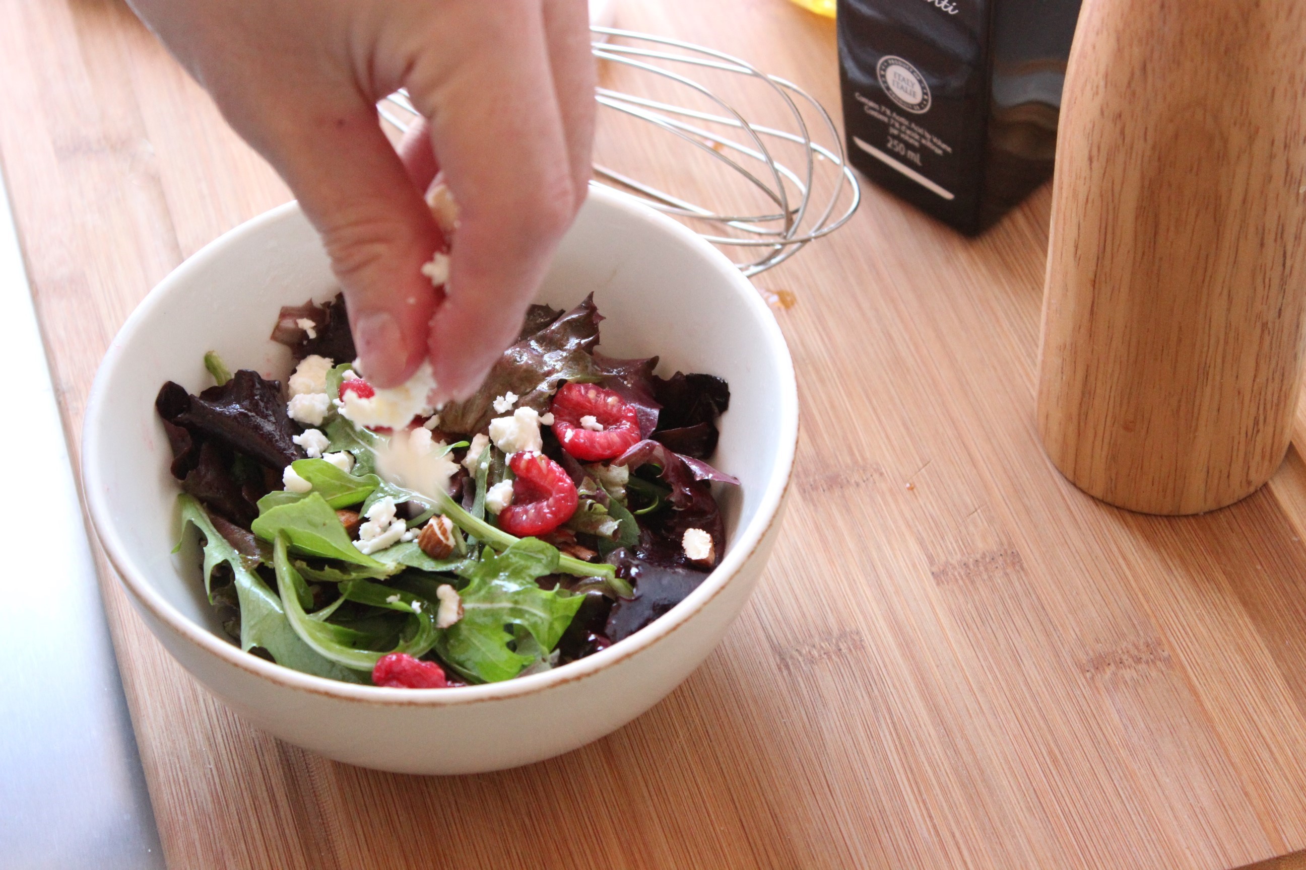 As for the toppings: berries, cheese, nuts or even pumpkins seeds work well. For this version we used, crumbled feta, chopped almonds and halved ripe raspberries – for a touch of sweetness!