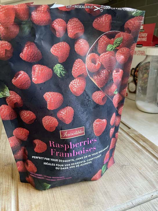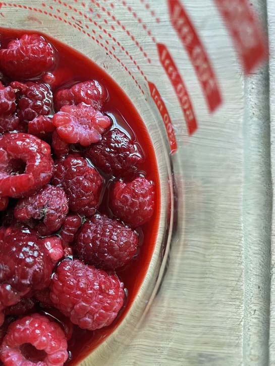 Pour raspberries in a microwave safe bowl. Defrost in the microwave – using the defrost function – for about 5 minutes. Remove from microwave and allow the raspberries to sit for 5 minutes so more of the sweet juice will seep out of the berries. You should end up with about 2 tablespoons of juice.