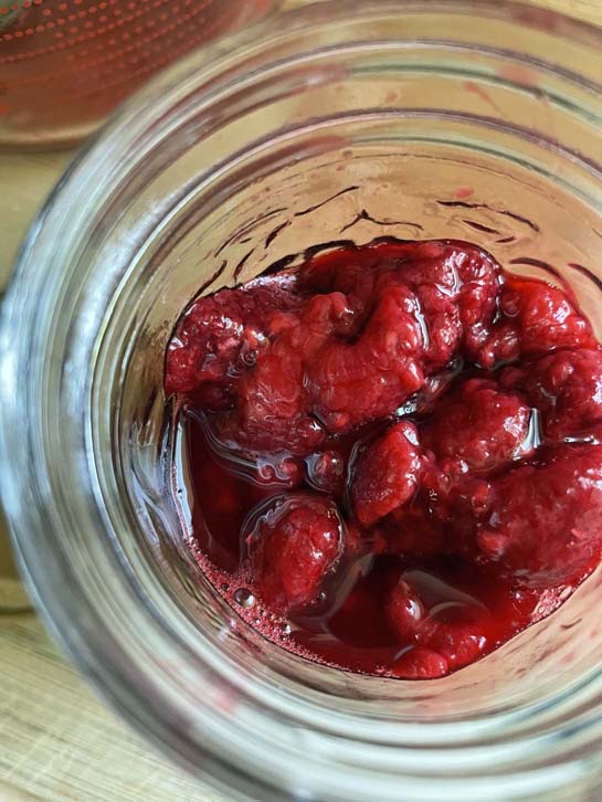 Pour the raspberry juice (not the raspberries) into a small saucepan and heat over medium-low heat. Add 1 teaspoon of sugar and whisk until the sugar dissolves, about 30 seconds. Then add 1 teaspoon of your cornstarch slurry, and whisk until the juice thickens but does not caramelize. Remove from heat. Add your sweet and thick juice back into the bowl with the raspberries and gently mix while trying to keep the raspberries intact. Store in a mason jar in the fridge, until you are ready to enjoy your sweet tasting raspberry topping!
