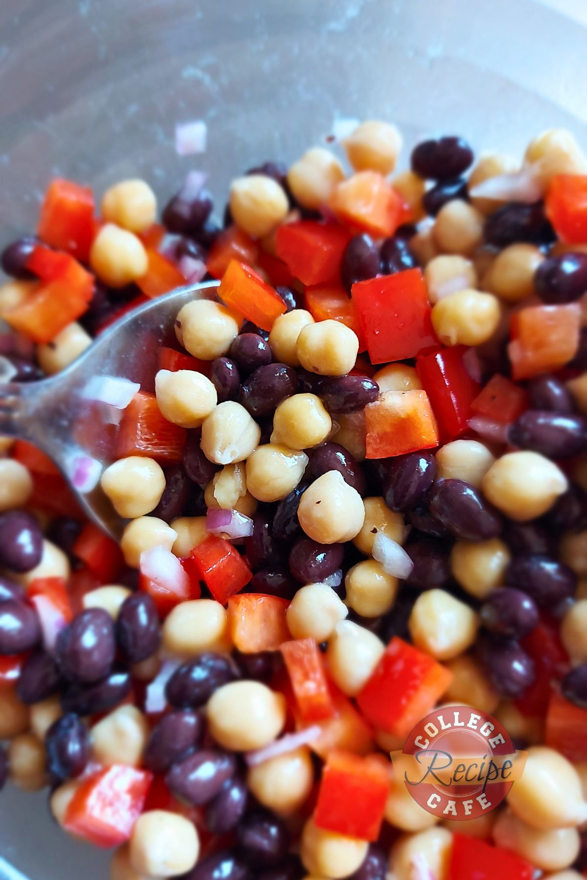 - In a large bowl, add both beans, red bell pepper, and onion. Pour dressing over top. Toss to coat ingredients with dressing. For the best flavor, cover and let sit in fridge for 20 minutes before serving.